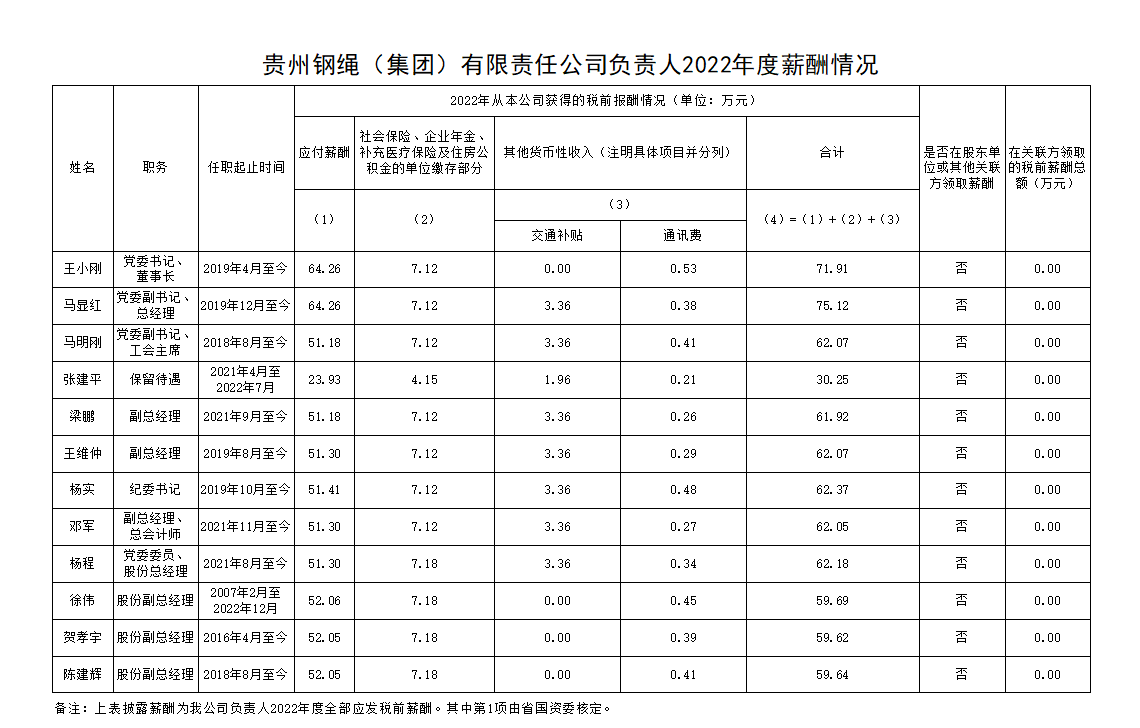 贵州钢绳(集团)有限责任公司负责人 2022年度薪酬情况-欧洲杯足球平台